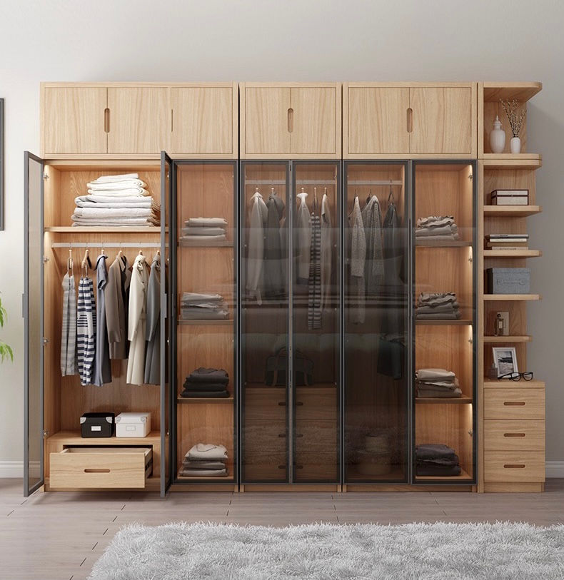 Incorporate drawers, shoe racks, hanging rods, and LED lighting to create a highly organized and accessible wardrobe layout.